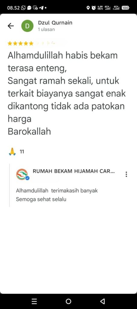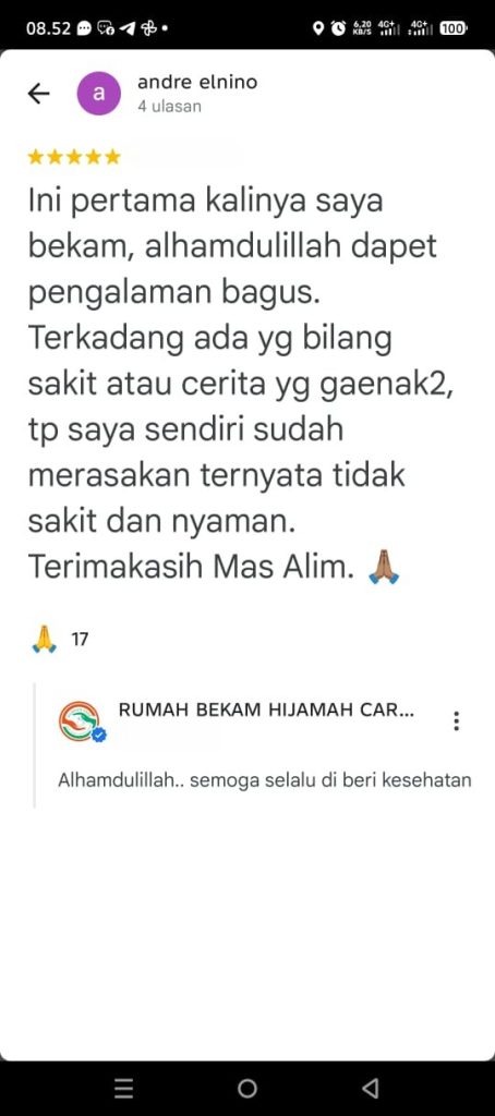 Kami berkomitmen, bahwa kesehatan adalah amanah yang harus dijaga. Oleh karenanya kami hadir dengan komitmen penuh untuk memberikan pelayanan terapi bekam yang mengikuti sunnah Rasulullah SAW. Setiap pasien yang datang kepada kami adalah tanggung jawab besar yang kami emban dengan penuh kehati-hatian. Kami tidak hanya memberikan terapi, tetapi juga membangun hubungan kepercayaan jangka panjang dengan setiap pasien.